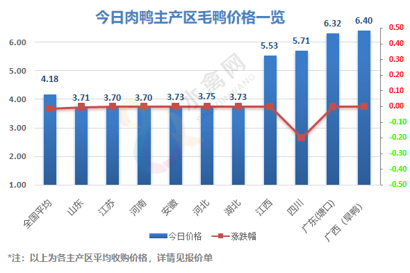 南方两广市场高位横盘、零星涨跌,目前广东白鸭主流成交参考6.05-6.60元/斤,泥鸭厂家采购价格6.3-6.6元/斤区间(详情见正文内附表)。全国监测区域毛鸭收购均价4.18元/斤,较去年同期上涨0.22元/斤,涨幅5.5%。