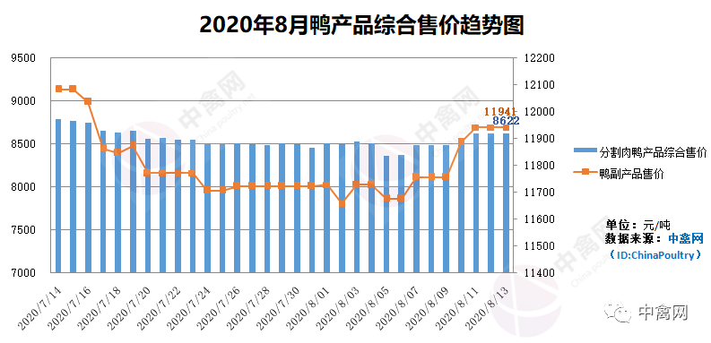8月13日监测数据,目前鸭分割产品综合售价参考8622元/吨,环比7月基本拉平;鸭副产品售价11941元/吨,环比7月上涨0.49%。本月鸭产品价格运行趋势图如下: