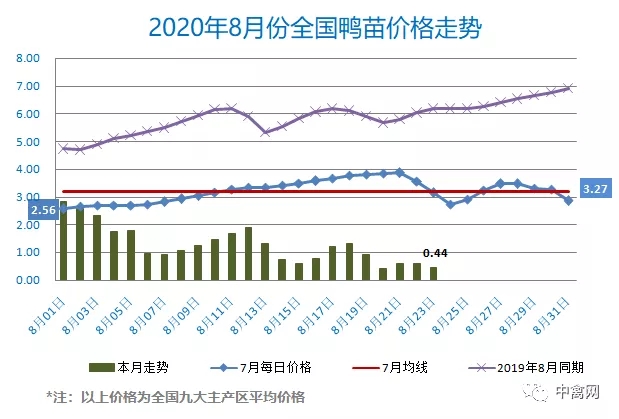 最新行情:明日上游端鸭苗、种蛋行情低位下挫、毛苗徘徊,其中北方鲁豫皖苏地区品牌苗厂报价普跌0.2元/羽,华南两广、江西、四川等地暂稳。8月中旬以来鸭苗巨幅下调、全线暴跌,市场再度出现打包、填埋、销毁惨烈一幕。临近北方冷藏中秋国庆双节停放期,市场无量运转。全国监测区域鸭苗成交均价0.44元/羽,较去年8月同期下跌5.28元/羽,跌幅89.8%,环比7月下跌2.62元/羽。