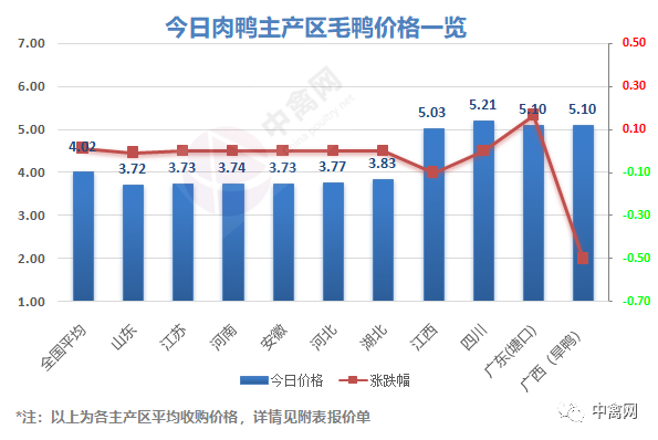 南方两广市场高位见顶、全线回落,在维持了近一个月的阶段高位之后、粤桂两广相继开启大跌调整。今天广西各地水、旱鸭普跌0.4-0.5元/斤不等,桂林旱鸭成交价跌破5元;广东大部企稳、略有回升,厂家及经纪人白鸭采购报价4.9-5.2元/斤,泥鸭亦开始下滑,惠州、湛江等地收购价下滑0.2元/斤左右(详情见正文内附表)。全国监测区域毛鸭收购均价4.02元/斤,较去年同期上涨0.05元/斤,涨幅1.3%。