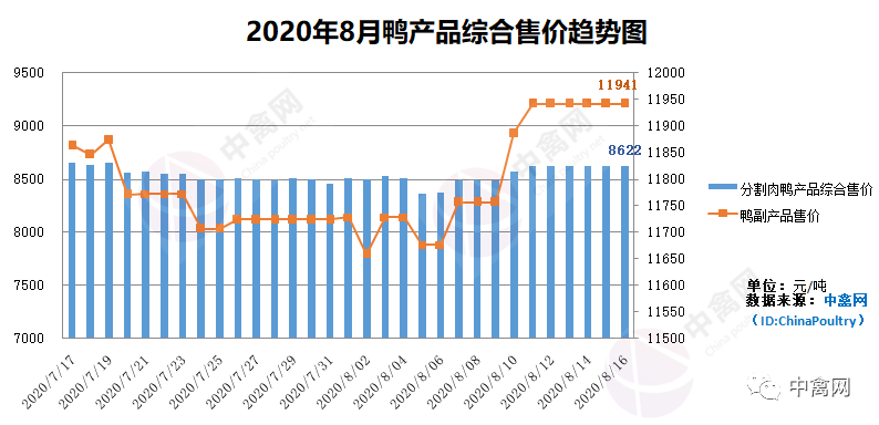 8月22日监测数据,目前鸭分割产品综合售价参考8622元/吨,环比7月基本拉平;鸭副产品售价11941元/吨,环比7月上涨0.49%。本月鸭产品价格运行趋势图如下:
