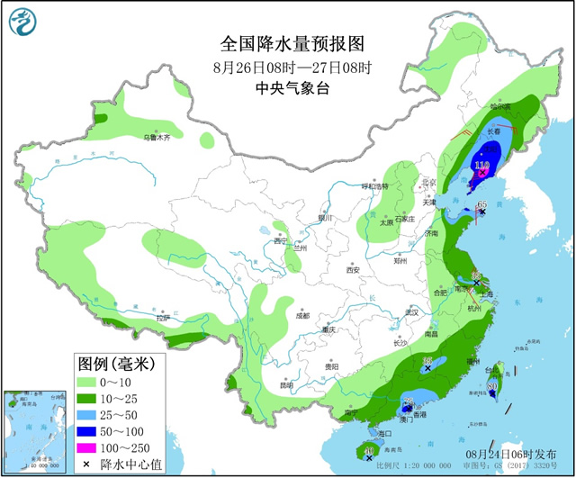 8月24日08时至25日08时,东北地区大部、黄淮东部、江淮北部、江汉南部、江南西北部、重庆东北部、贵州东部和南部、四川南部、云南大部、广西西北部等地的部分地区有中到大雨,其中,黑龙江东北部、吉林中南部、辽宁中东部、山东半岛、湖北西南部、湖南北部、云南西部和北部等地有暴雨或大暴雨(100~150毫米)。内蒙古中部、河北北部、辽宁、山东半岛、浙江北部等地有4~6级风(见图2)。