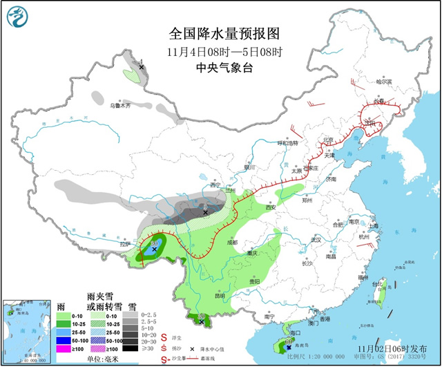 11月2日08时至3日08时,内蒙古东北部、东北地区北部和东部、青藏高原北部和东部、甘肃南部等地部分地区有小雪或雨夹雪,其中,黑龙江西北部局地有中到大雪(5~8毫米)。西藏东南部、西北地区东南部、西南地区大部、江南东北部、广西西部和北部等地部分地区有小到中雨,其中,西藏东南部、云南中西部局地有大雨(25~45毫米)。内蒙古东部、华北北部和西部、东北地区西部、西藏北部等地部分地区有4~6级风,局地有6~7级风(见图2)。