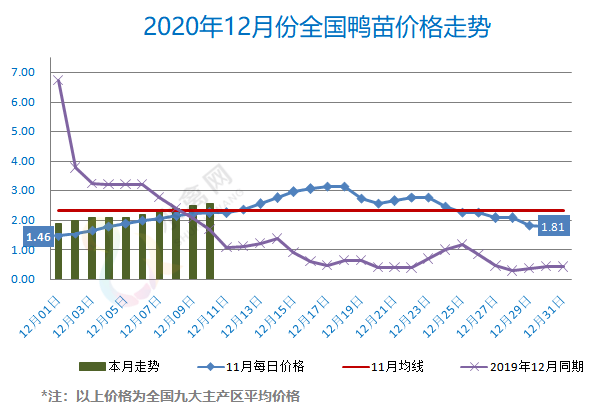 最新行情:明日上游端鸭苗、种蛋行情借势高报、节节上行,除西南四川暂稳外,其他区域主流孵化厂家开票报价再涨0.1元/羽。种蛋方面由于处于停止上孵、规避春节假期阶段,价格依然在低位徘徊。全国监测区域鸭苗成交均价2.56元/羽,较去年12月同期上涨1.04元/羽,涨幅68.4%,环比11月上涨0.25元/羽。