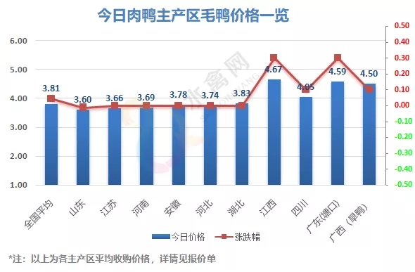 12月13日全国商品鸭出栏价格跳涨拉升、南涨北稳。其中南方广东、江西今天大涨0.3元/斤、强势反弹,目前广东各地白鸭主流成交价回升至4.5-4.8元/斤。广西方面水鸭持稳,南宁、钦州旱鸭有小涨。全国监测区域毛鸭收购均价3.81元/斤,较去年同期下跌0.35元/斤,跌幅8.4%。