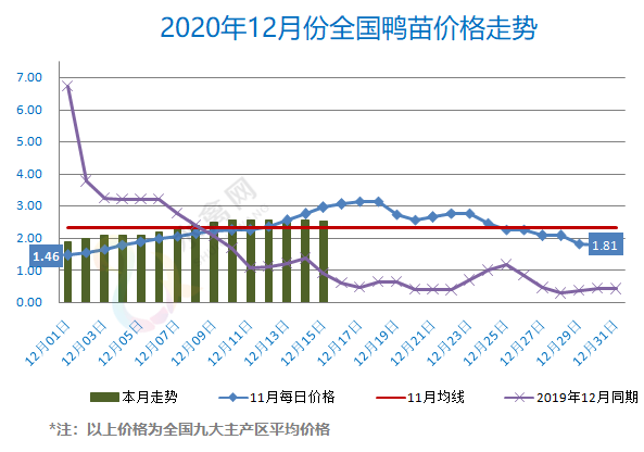 最新行情:明日全国鸭苗价格久盘必跌、全线跳水,各区域主流孵化厂家开票报价普遍下调0.2-0.5元/羽不等。全国监测区域鸭苗成交均价2.06元/羽,较去年12月同期上涨0.54元/羽,涨幅35.5%,环比11月下跌0.25元/羽。
