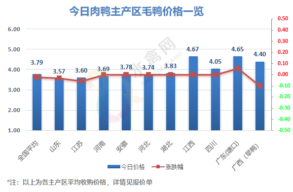 南方市场两广价格暂稳,中南江西、四川、重庆方面有0.1元/斤小幅涨价。目前广东白鸭主流成交在4.6-4.8元/斤,泥鸭厂家采购指导价参考4.1-4.2元/斤。全国监测区域毛鸭收购均价3.80元/斤,较去年同期下跌0.35元/斤,跌幅8.4%。