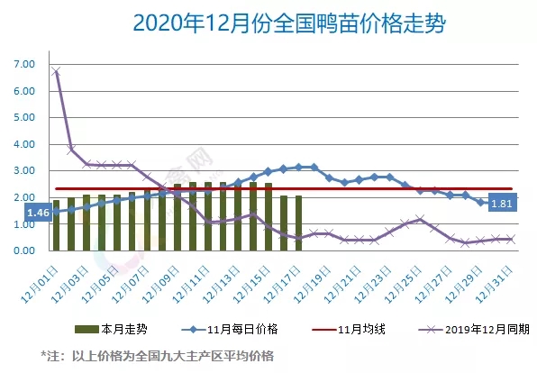 最新行情:明日上游端鸭苗、种蛋行情跌后暂稳、低迷徘徊,继昨天的价格跳水、大幅度回落后,明天各区域主流孵化厂家参考报价维持暂稳。受国内新冠疫情反弹、新增确诊增加、冻肉冷链阳性事件等利空消息影响,行业对未来预期普遍趋于谨慎和悲观。全国监测区域鸭苗成交均价2.06元/羽,较去年12月同期上涨0.54元/羽,涨幅35.5%,环比11月下跌0.25元/羽。