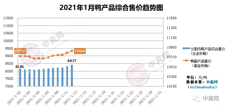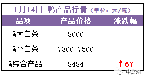 1月14日主产区重点监测规模冷藏企业白条鸭价格不动、半鸭类上涨100-200元/吨,主销鸭分割及副产单品价格多点开花、延续小幅上调。