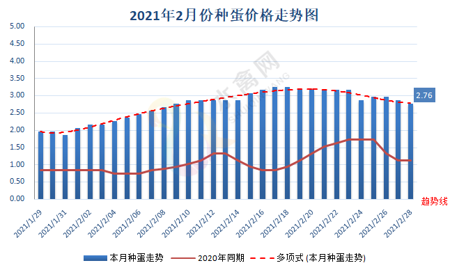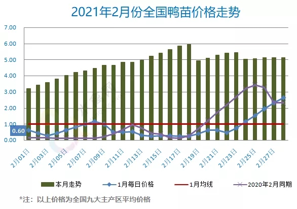 最新行情:明日全国鸭苗行情抱团挺价、横盘暂稳,各区域主流孵化厂家参考报价不动。整体来看,正月以来的行情启动较快,由于节前毛苗低迷行情的持续打击,使得业内对跨年阶段行情较为悲观,进入正月后孵化端出苗量连续低位,供给紧张、局地一苗难求情况再度上演,北方樱桃谷鸭苗一度冲上6元。但随着各厂家的恢复出孵,量价背离、一骑绝尘的苗价也面临着理性回归。全国监测区域鸭苗成交均价5.12元/羽,较去年2月同期上涨4.07元/羽,涨幅387.6%,环比1月上涨4.14元/羽。