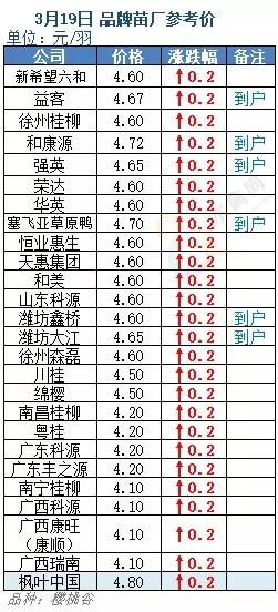 3月18日全国商品鸭出栏价格粤桂反弹、活禽拉升。其中华南活禽区域谷底回升、否极泰来,今天两广地区冷藏厂、采购商报价上涨0.2-0.4元/斤不等。目前广东各品种大鸭价格参考如下:白鸭主流成交4.6-4.8元/斤,麻鸭、泥鸭价格稳中偏弱,棚头装车价参考6.2-6.4元/斤。