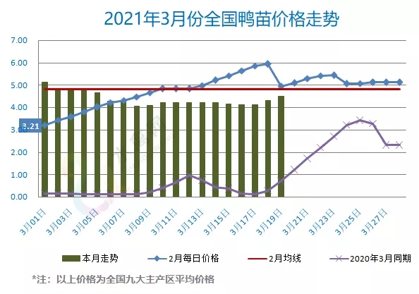 最新行情:明日上游端鸭苗、种蛋行情反转回升、全线飘红,各区域主流孵化厂家参考报价普涨0.2元/羽。整体来看,樱桃谷白鸭正月以来的行情启动较快,由于前期河北地区疫情、叠加节前毛苗低迷行情的打击,使得业内对跨年阶段行情较为悲观,进入正月后孵化端出苗量连续低位,局地供给紧张、一苗难求情况再度上演,北方樱桃谷鸭苗一度冲上6元。近期虽有所调整,但整体依然运行在中等偏高位。全国监测区域鸭苗成交均价4.50元/羽,较去年3同期上涨3.37元/羽,涨幅287.1%,环比2月下滑0.32元/羽。