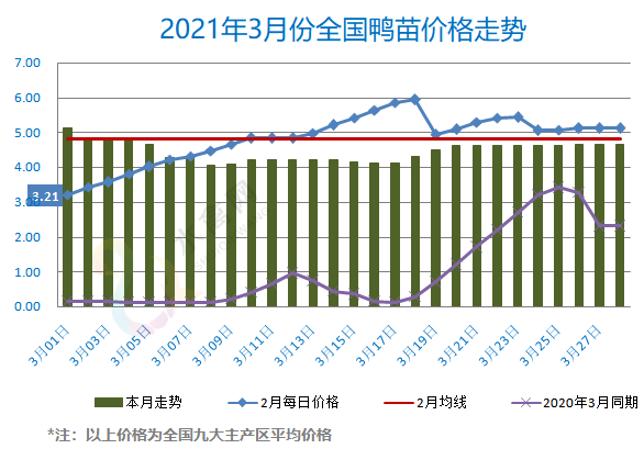 最新行情:明日上游端鸭苗、种蛋行情延续横盘态势、全线暂稳,各区域主流孵化厂家参考报价不动,其中北苗已连续一周徘徊在4.7元/羽一线。全国监测区域鸭苗成交均价4.66元/羽,较去年3同期上涨3.53元/羽,涨幅309.8%,环比2月下滑0.16元/羽。