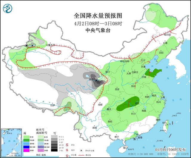 4月1日至2日,我国北方地区自西向东有大范围雨雪天气,新疆北疆西部、青海、甘肃中南部等地有中到大雪或雨夹雪,局地暴雪,华北、东北、黄淮及陕西等地有小雨,局地中雨。