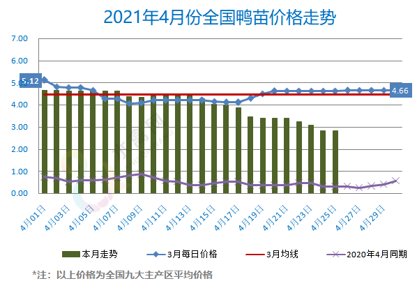 最新行情:明日上游端鸭苗、种蛋行情止跌企稳、横盘运行,各区域主流孵化厂家开票报价暂稳,目前南北方苗价已全线跌破3元整数关。近期鸭产品再度承压走低,冷藏屠宰端企业经营压力凸显,部分厂家相继对鸭苗进行采购限价。全国监测区域鸭苗成交均价2.84元/羽,较去年4月同期上涨2.34元/羽,涨幅467.1%,环比3月下跌1.64元/羽。