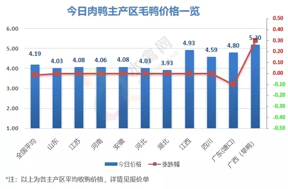 4月24日全国商品鸭出栏价格震荡趋弱、区域调整。其中广东再度出现下滑,广西水、旱鸭有不同程度上涨。目前两广各品种鸭行情参考如下:白鸭主流成交参考4.7-4.9元/斤,麻鸭参考6.1-6.4元/斤,泥鸭全面跌破6元,棚头装车价参考5.6-5.9元/斤;广西水、旱鸭装车价参考5.9和5.2元/斤。