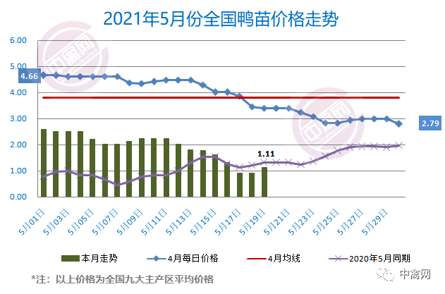 最新行情:明日上游端鸭苗、种蛋(品种:樱桃谷)行情跌无可跌、触底反弹,各区域主流孵化厂家开票报价上调0.1-0.3元/羽不等。经过上周以来的持续阴跌下调,华南两广、江西、四川等地实发价格先后跌破1元,毛苗行情再现。全国监测区域鸭苗成交均价1.11元/羽,较去年5月同期下跌0.15元/羽,跌幅11.9%,环比4月下跌2.70元/羽。