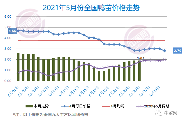 最新行情:明日上游端鸭苗、种蛋(品种:樱桃谷)行情苗稳蛋降、上行遇阻,种蛋方面成交价格跌落0.1-0.2元/枚,鸭苗方面各区域主流孵化厂家报价暂稳。全国监测区域鸭苗成交均价1.87元/羽,较去年5月同期上涨0.61元/羽,涨幅48.4%,环比4月下跌1.94元/羽。