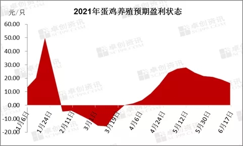 据卓创资讯监测数据显示,2021年3月第五周蛋鸡养殖预期盈利恢复至养殖成本线上,在经历连续七周增长后,5月第三周起蛋鸡养殖预期盈利收窄。截至6月第三周,按当时价格及成本推算,未来蛋鸡养殖盈利降至每只16.38元。