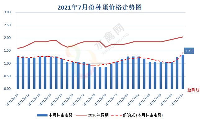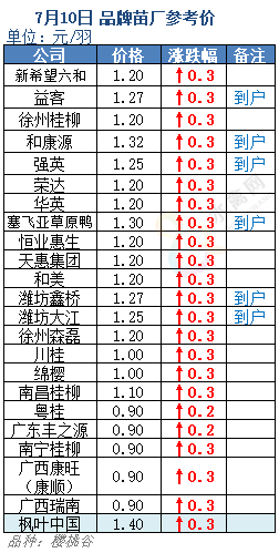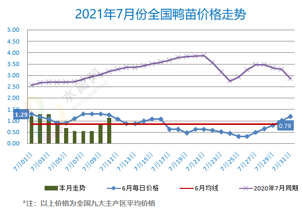 最新行情:明日上游端鸭苗、种蛋行情多头发力、苗蛋齐升,各区域主流孵化厂家明天开票报价再涨0.2-0.3元/羽。自6月底以来随着猪价的V型反转、暴涨拉升,家禽行业重拾信心,各地孵化厂家借势上调禽苗报价。然而鸭苗涨得快跌得更快,上周末的“三连降”基本将前期涨幅吞噬,长期亏损之下、行业内部分厂家已资金短缺、周转不济。全国监测区域鸭苗成交均价1.12元/羽,较去年7月同期下滑2.09元/羽,跌幅65.1%,环比6月上涨0.27元/羽。
