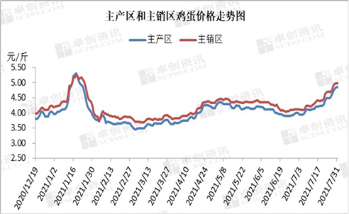 7月鸡蛋价格震荡走高,主产区鸡蛋月均价4.27元/斤,环比涨幅5.69%,同比涨幅41.86%;主销区鸡蛋月均价4.43元/斤,环比涨幅4.98%,同比涨幅39.56%。
