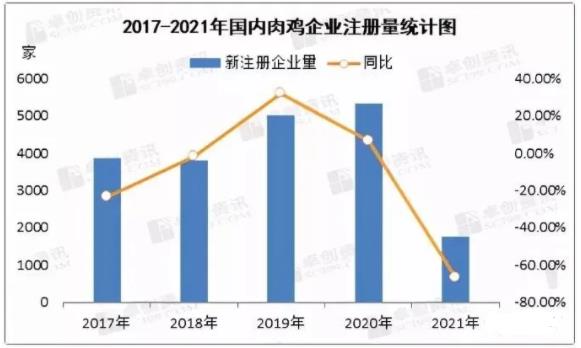 根据行业统计数据来看,从2017年起到2020年,国内的肉鸡企业新增量就呈震荡增加的趋势,而到了2021年开始止涨回落。且同比跌幅超65%,新增量创近五年新低。