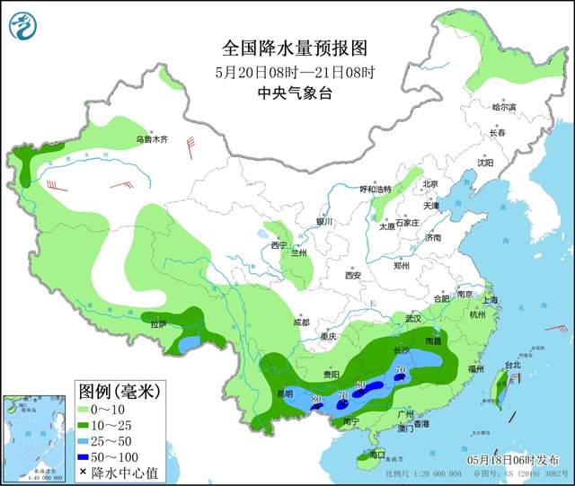 图1 全国降水量预报图(5月18日08时-19日08时)