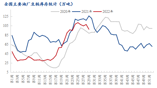 豆粕供应的多少由上游油厂大豆压榨水平决定,据Mysteel农产品对全国主要油厂的调查情况显示,本周第29周(7月16日至7月22日)111家油厂大豆实际压榨量为167.73万吨,开机率为58.30%。本周油厂实际开机率略低于此前预期,较预估低0.99万吨。具体来看,整体各区域下周开机率较本周涨跌互现,变化相对较小。但全国油厂大豆压榨量连续三周下调,此前第27周(7月2日至7月8日)111家油厂大豆实际压榨量为171.05万吨,开机率为59.45%。开机水平都略低于往年水平。预计下周2022年第30周(7月23日至7月29日)国内油厂开机率略有上升,油厂大豆压榨量预计171.69万吨,开机率为59.68%。随着巴西大豆到港量的增加,每周预计50万吨国储大豆拍卖少量流入市场,油厂开机的保持相对高位,具体视下游的需求进行调整。