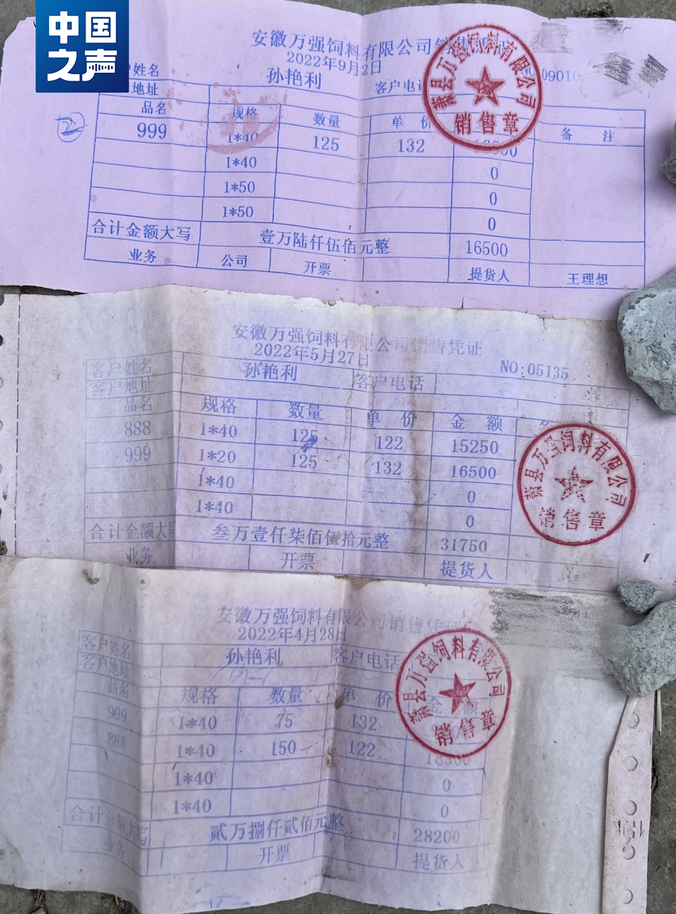 中国之声记者先后走访了安徽省蚌埠市怀远县包集镇、淝河镇、古城镇,宿州市埇桥区桃园镇等地近二十家养殖户,他们都表示使用了安徽省宿州市萧县万强饲料有限公司生产的“万强888肉牛育肥期精料补充料”和“万强999肉牛育肥后期精料补充料”后,存在肉牛生长速度放缓的情况,使用问题饲料时间越长,受损越严重。