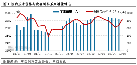 中国饲料工业协会监测数据显示,二季度样本企业配合饲料中玉米用量延续3月份的下降趋势,由876万吨降至838万吨,降幅4.33%;季度总用量2567万吨,较去年同期增加7.47%。玉米是重要的能量饲料原料,其次是小麦、大麦、高粱、稻谷等,配合饲料的玉米用量主要受到玉米价格及其替代品价差的影响,其中小麦对玉米的替代作用最为明显。从图1中可看出,6-7月份多是年内配合饲料玉米用量的季节性低点,主要原因是下游畜禽需求处于淡季,以及新季小麦上市价格阶段性回落,替代部分饲用玉米。(备注:配合饲料玉米用量=配合饲料产量×配合饲料中玉米用量占比)