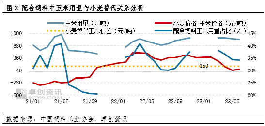 实际饲料生产过程中,小麦价格低于玉米价格150元/吨,现实即存在饲用小麦对玉米的替代行为。从图2中可看出,2021年1-10月份,饲用小麦存在明显的价格优势,最大价差接近350元/吨,上半年配合饲料玉米用量占比最低降至31%。随着玉米库存消耗,大量低价小麦进入饲料企业,叠加6月份的价格优势,玉米用量占比持续降低,5-10月份玉米用量占比从40.8%降至20.5%,累计下降20.3个百分点,玉米用量也出现明显减少。2022年至2023年4月,小麦价格较高,两者的价差始终维持在220-500元/吨,难以替代饲用玉米,配合饲料玉米用量占比始终处于30%以上,最高接近41%。进入2023年,小麦价格持续下跌,施压玉米市场,同时部分饲料企业使用进口玉米或国内稻谷替代玉米,导致上半年玉米用量整体萎缩。4月份开始,小麦存在替代价格优势,山东南部等饲料企业加大小麦采购力度,玉米用量减少。6月新季小麦上市后,由于河南、安徽、山东等主产区遭遇连续降雨,芽麦供应量明显增加,且具有明显价格优势,饲料企业持续采购芽麦替代玉米,今年4-6月份配合饲料玉米用量占比由38.1%持续降至34.2%,降幅近4个百分点。
