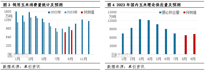卓创资讯通过样本监测以及德尔菲法,综合评估7月饲用玉米消费量降至850万吨,较6月下降19.05%,符合历史规律。随着高温天气消退,且终端市场肉类消费旺季到来,8-9月份国内畜禽产能以及采食量均有增加预期,所以饲用玉米消费量将触底回升,对玉米价格或有一定提振作用。