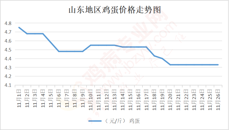 鸡病专业网消息:11月26日,山东地区莱阳鸡蛋4.4元/斤,稳;青岛鸡蛋4.4元/斤,稳;诸城鸡蛋4.4元/斤,稳 ;安丘鸡蛋4.3元/斤,稳;昌乐鸡蛋4.3元/斤,稳;寿光鸡蛋4.3元/斤,稳;昌邑鸡蛋4.3元/斤,稳;高密鸡蛋4.4元/斤,稳;青州鸡蛋4.3元/斤,稳;临朐鸡蛋4.3元/斤,稳;莱州鸡蛋4.4元/斤,稳;威海鸡蛋4.4元/斤,稳;临沭鸡蛋4.25元/斤,稳;沂水鸡蛋4.25元/斤,稳;沂南鸡蛋4.25元/斤,稳;莒南鸡蛋4.25元/斤,稳;兰陵县鸡蛋4.25元/斤,稳;日照鸡蛋4.25元/斤,稳;莒县鸡蛋4.25元/斤,稳;日照辛萁商贸鸡蛋4.25元/斤,稳;泗水鸡蛋价格126元/30斤,稳;济宁、汶上鸡蛋价格126元/30斤,稳;梁山、东平红蛋价格126元/30斤,稳;枣庄滕州地区鸡蛋混码主流到户127元/30斤,稳;泰安地区新泰鸡蛋价格126元/30斤,稳;菏泽地区曹县主流到户126元/30斤,稳;成武鸡蛋价格126元/30斤,稳;单县到户126元/30斤,稳;聊城莘县126元/30斤,稳。