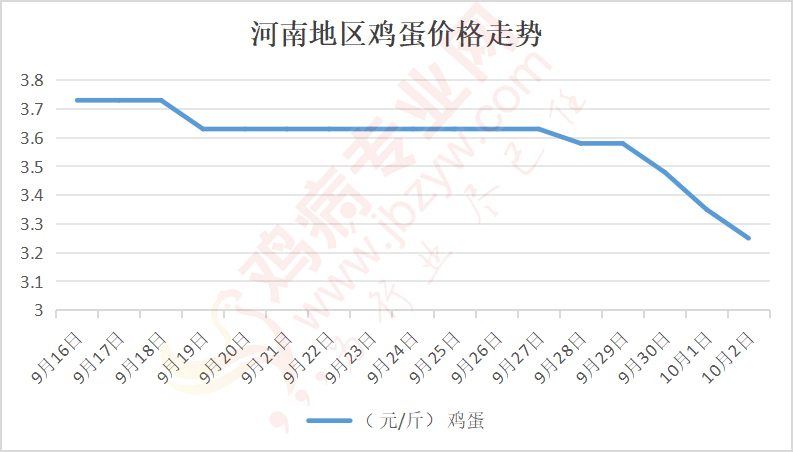 鸡病专业网消息:10月2日,河南郑州鸡蛋3.3元/斤,落;新密鸡蛋3.3元/斤,落;荥阳鸡蛋3.3元/斤,落;中牟鸡蛋3.3元/斤,落;周口鸡蛋3.2元/斤,落;商丘鸡蛋97元/30斤,落;鹤壁鸡蛋3.2元/斤,落;汝州鸡蛋3.2元/斤,落;开封鸡蛋97元/30斤,落;漯河鸡蛋3.2元/斤,落;漯河临颍鸡蛋3.2元/斤,落;许昌鸡蛋3.2元/斤,落;南阳鸡蛋3.2元/斤,落;南阳邓州鸡蛋3.2元/斤,落;新乡鸡蛋3.2元/斤,落;安阳鸡蛋3.2元/斤,落;新郑鸡蛋3.3元/斤,落;登封鸡蛋3.3元/斤,落;平顶山鸡蛋3.25元/斤,落;驻马店鸡蛋3.25元/斤,落;三门峡鸡蛋3.25元/斤,落;焦作鸡蛋3.2元/斤,落;信阳鸡蛋3.2元/斤,落;濮阳鸡蛋3.2元/斤,落。