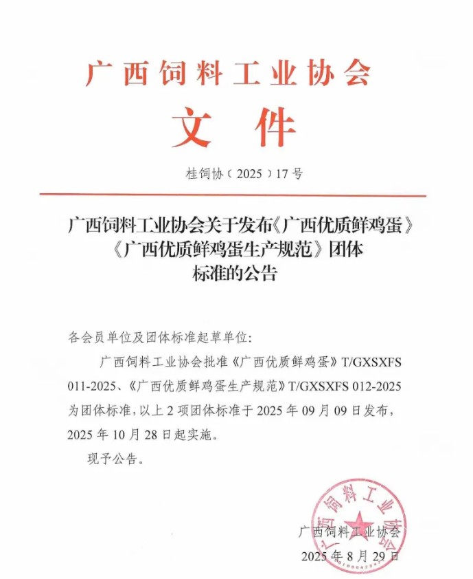 由广西大学农牧产业发展研究院牵头,联合广西壮族自治区畜牧站、广西十七家大中型蛋鸡养殖企业共同起草完成的《广西优质鲜鸡蛋》和《广西优质鲜鸡蛋生产规范》两项团体标准9月9日发布,10月28日正式实施!