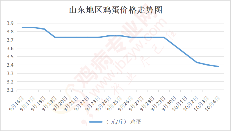 鸡病专业网消息:10月4日,山东地区莱阳鸡蛋3.35元/斤,落;青岛鸡蛋3.35元/斤,落;诸城鸡蛋3.4元/斤,落;安丘鸡蛋3.35元/斤,落;昌乐鸡蛋3.35元/斤,落;寿光鸡蛋3.35元/斤,落;昌邑鸡蛋3.35元/斤,落;高密鸡蛋3.4元/斤,落;青州鸡蛋3.35元/斤,落;临朐鸡蛋3.35元/斤,落;莱州鸡蛋3.35元/斤,落;威海鸡蛋3.35元/斤,落;临沭鸡蛋3.35元/斤,稳;沂水鸡蛋3.35元/斤,稳;沂南鸡蛋3.35元/斤,稳;莒南鸡蛋3.35元/斤,稳;兰陵县鸡蛋3.35元/斤,稳;日照鸡蛋3.35元/斤,稳;莒县鸡蛋3.35元/斤,稳;日照辛萁商贸鸡蛋3.35元/斤,稳;泗水鸡蛋价格98元/30斤,稳;济宁、汶上鸡蛋价格98元/30斤,稳;梁山、东平红蛋价格98元/30斤,稳;枣庄滕州地区鸡蛋混码主流到户99元/30斤,稳;泰安地区新泰鸡蛋价格98元/30斤,稳;菏泽地区曹县主流到户98元/30斤,稳;成武鸡蛋价格98元/30斤,稳;单县到户98元/30斤,稳;聊城莘县96元/30斤,稳。
