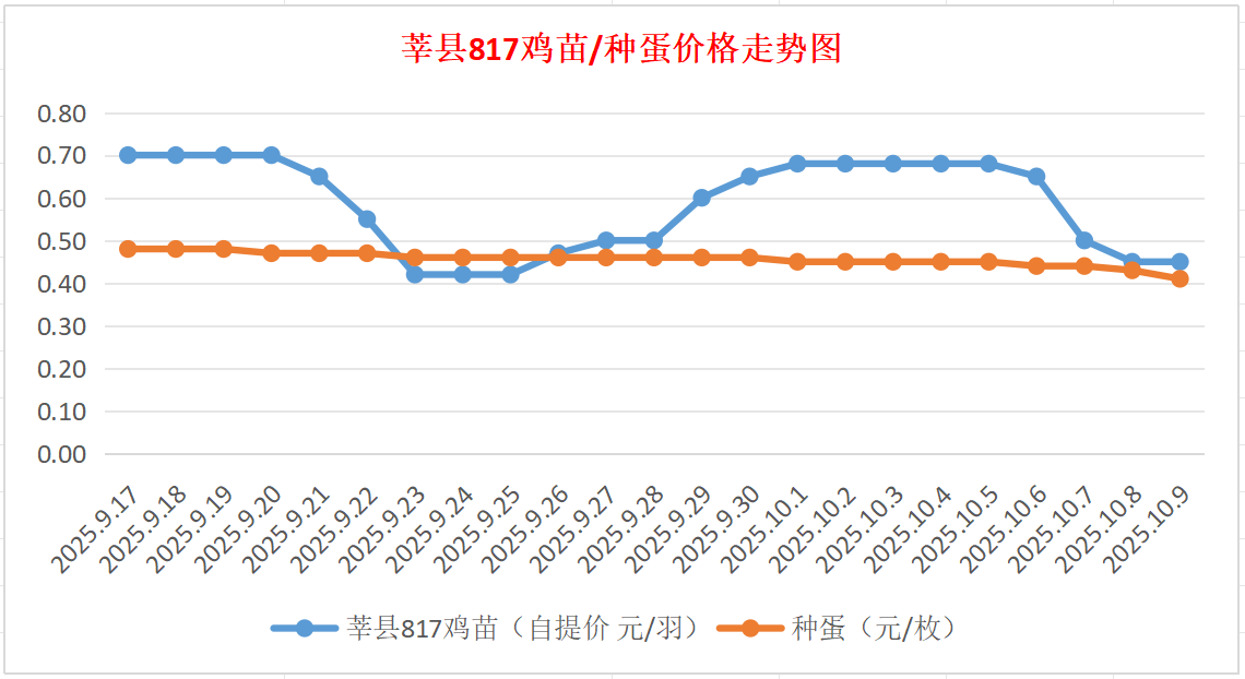 817鸡苗(混合):报价自提0.45元/羽。(稳)