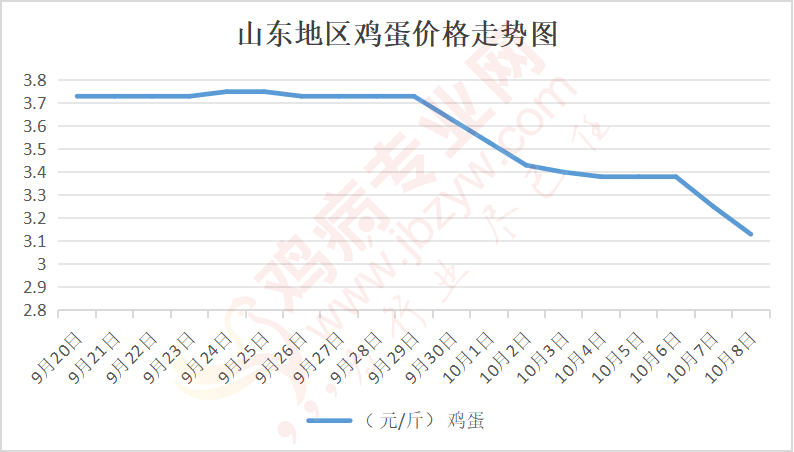 鸡病专业网消息:10月8日,山东地区莱阳鸡蛋3.15元/斤,落;青岛鸡蛋3.15元/斤,落;诸城鸡蛋3.2元/斤,落;安丘鸡蛋3.05元/斤,落;昌乐鸡蛋3.05元/斤,落;寿光鸡蛋3.05元/斤,落;昌邑鸡蛋3.05元/斤,落;高密鸡蛋3.2元/斤,落;青州鸡蛋3.05元/斤,落;临朐鸡蛋3.05元/斤,落;莱州鸡蛋3.15元/斤,落;威海鸡蛋3.15元/斤,落;临沭鸡蛋3元/斤,落;沂水鸡蛋3元/斤,落;沂南鸡蛋3元/斤,落;莒南鸡蛋3元/斤,落;兰陵县鸡蛋3元/斤,落;日照鸡蛋3元/斤,落;莒县鸡蛋3元/斤,落;日照辛萁商贸鸡蛋3元/斤,落;泗水鸡蛋价格90元/30斤,落;济宁、汶上鸡蛋价格90元/30斤,落;梁山、东平红蛋价格90元/30斤,落;枣庄滕州地区鸡蛋混码主流到户92元/30斤,落;泰安地区新泰鸡蛋价格90元/30斤,落;菏泽地区曹县主流到户90元/30斤,落;成武鸡蛋价格90元/30斤,落;单县到户90元/30斤,落;聊城莘县88元/30斤,落。