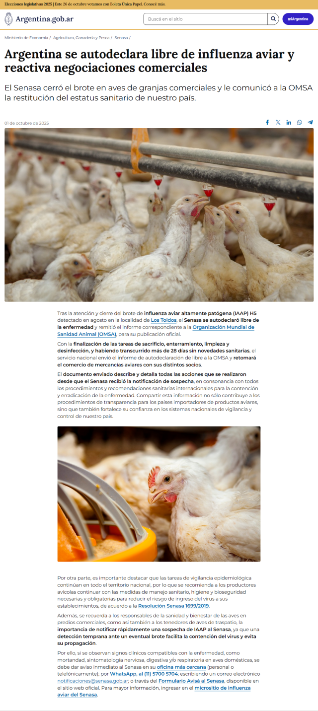 2025年10月1日阿根廷官网公告:Senasa结束了商业养殖场家禽的疫情,并向 WOAH 通报了该国卫生状况的恢复情况。
