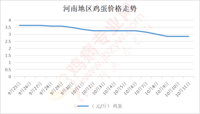 鸡病专业网消息:10月11日,河南郑州鸡蛋2.9元/斤,稳;新密鸡蛋2.9元/斤,稳;荥阳鸡蛋2.9元/斤,稳;中牟鸡蛋2.9元/斤,稳;周口鸡蛋2.8元/斤,稳;商丘鸡蛋84-85元/30斤,稳;鹤壁鸡蛋2.8元/斤,稳;汝州鸡蛋2.8元/斤,稳;开封鸡蛋85元/30斤,稳;漯河鸡蛋2.8元/斤,稳;漯河临颍鸡蛋2.8元/斤,稳;许昌鸡蛋2.8元/斤,稳;南阳鸡蛋2.8元/斤,稳;南阳邓州鸡蛋2.8元/斤,稳;新乡鸡蛋2.8元/斤,稳;安阳鸡蛋2.8元/斤,稳;新郑鸡蛋2.9元/斤,稳;登封鸡蛋2.9元/斤,稳;平顶山鸡蛋2.85元/斤,稳;驻马店鸡蛋2.85元/斤,稳;三门峡鸡蛋2.85元/斤,稳;焦作鸡蛋2.8元/斤,稳;信阳鸡蛋2.8元/斤,稳;濮阳鸡蛋2.8元/斤,稳。