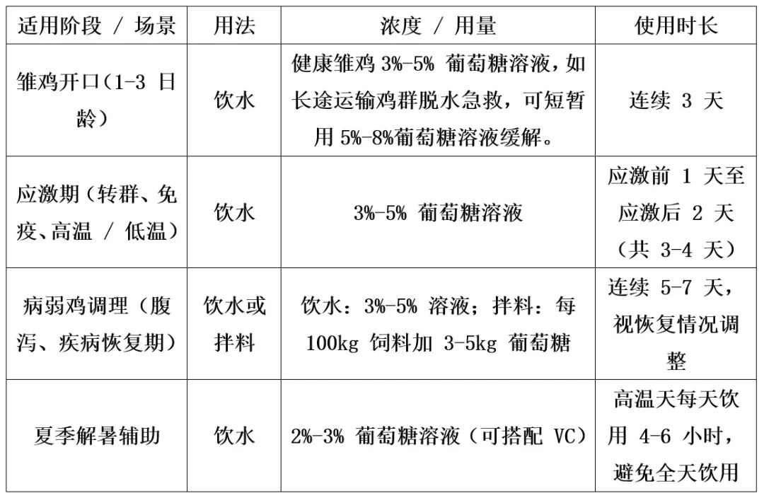 不可长期高浓度使用:长期饮用5%葡萄糖水会导致鸡群采食量降低(高糖影响食欲),还可能引发肠道菌群紊乱或增加肾脏代谢负担。