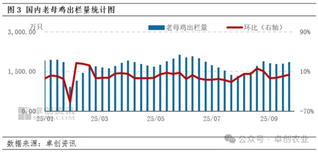 鸡苗销量持续减少,后备蛋鸡存栏占比继续压缩。9月后备蛋鸡占比下滑,主要受到鸡苗销量影响。2025年蛋鸡鸡苗销量呈先增后减趋势,其中1-4月鸡苗销量呈增加趋势,5-9月鸡苗销量开启下行通道,鸡苗销量持续下滑,9月鸡苗销量环比跌幅超过1.50%,导致后备蛋鸡群体中新增量小于减少量,因此9月后备蛋鸡存栏占比呈压缩局面,占比环比减少0.26个百分点。