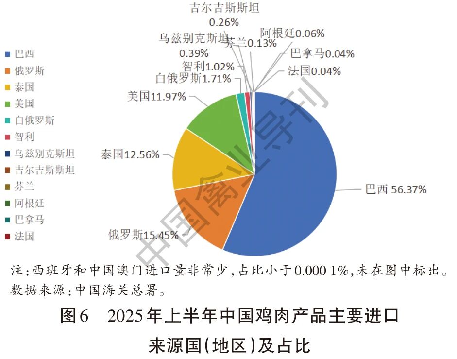 2025年上半年进口鸡肉产品主要来源于巴西、俄罗斯、泰国、美国、白俄罗斯、智利等国家(地区)(见图6),较2024年同期来源国(地区)新增了智利、芬兰、阿根廷、巴拿马、法国、西班牙和中国澳门。来自巴西、俄罗斯、泰国和美国四大最主要进口来源国的鸡肉进口量分别为26.88万吨、7.36万吨、5.99万吨、5.71万吨,进口额分别为7.32亿美元、2.09亿美元、2.37亿美元、2.12亿美元。来自上述四国的鸡肉进口量总计45.94万吨,在中国鸡肉产品进口总量中的占比达到96.35%,进口量较2024年同期增长17.89%,其中来自俄罗斯的鸡肉产品进口增长显著,进口量和进口额分别增长29.70%和24.03%。从巴西进口的以生鲜冷冻品为主,包括冻鸡翼(不包括翼尖)、冻鸡爪和带骨的冻鸡块等,三个品类的进口量为23.86万吨,占从巴西总进口量的88.80%;从俄罗斯和泰国进口的品类以冻鸡爪和冻鸡翼(不包括翼尖)等生鲜冷冻品为主,进口量分别为72.70万吨、50.56万吨,分别占从俄罗斯、泰国总进口量的98.71%、84.46%;从美国进口的主要是其他制作或保藏的鸡肉及食用杂碎和冻鸡爪,二者进口量53.22万吨,占从美国总进口量的93.23%。