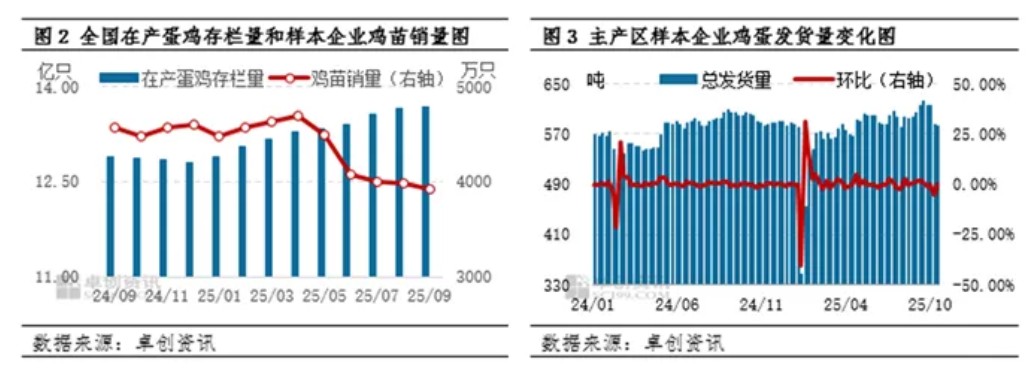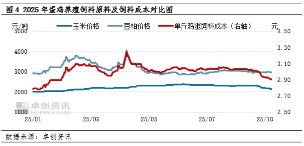 原料一降一稳,养殖成本或微降。近期新粮上市,短期玉米价格或延续偏弱走势。受国内油厂库存均处于年内高位影响,市场心态普遍观望,卓创资讯预计短期豆粕价格低位趋稳运行。饲料原料价格或一降一稳,因此11月预计鸡蛋饲料成本或走低,但降幅或不大,对盈利改善作用有限。
