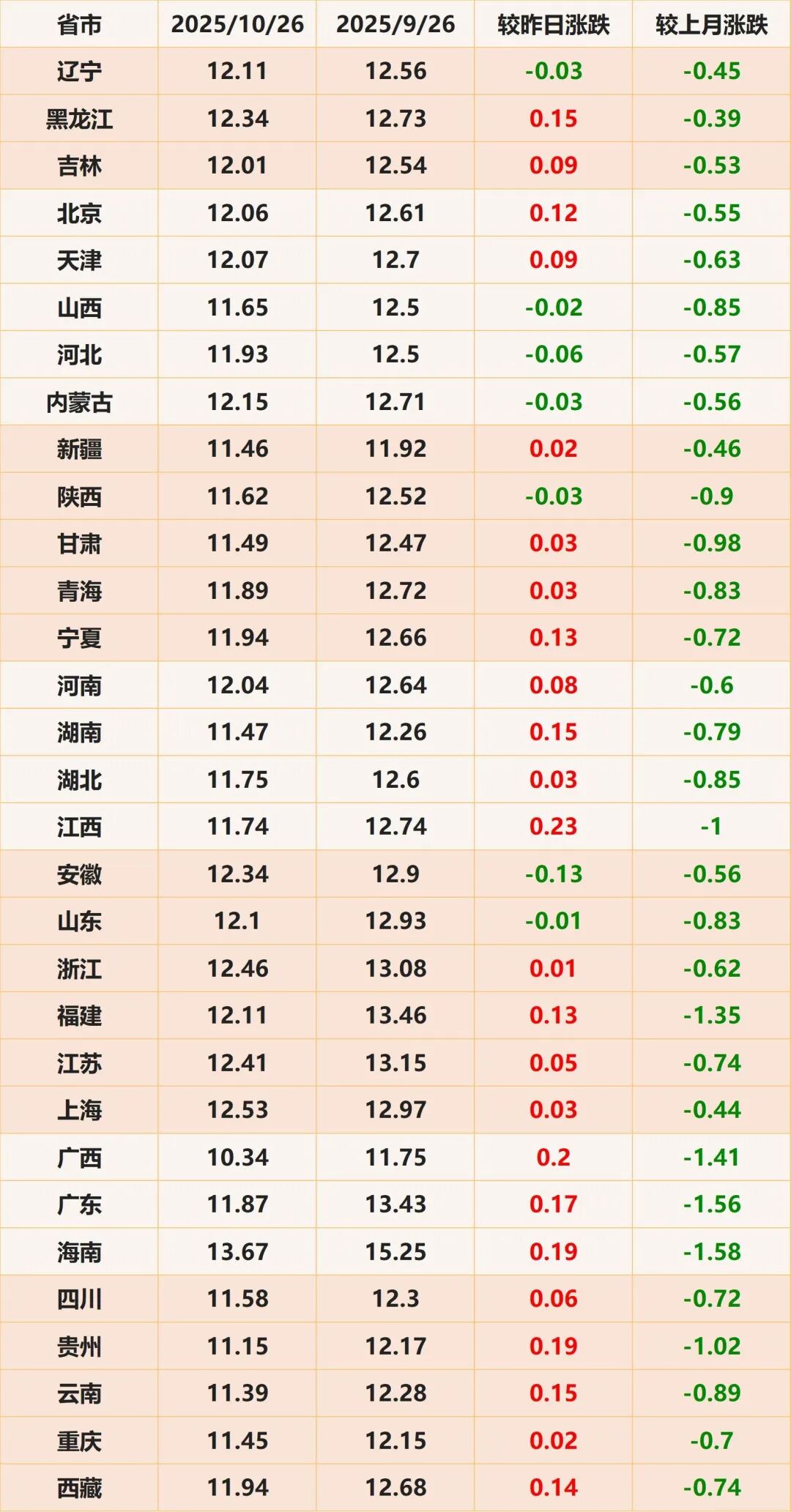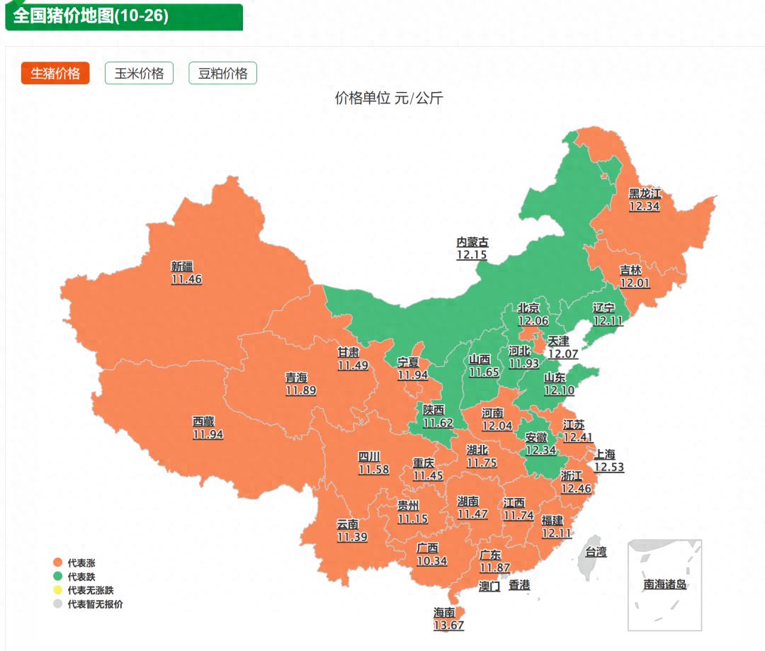据猪好多数据监测显示,10月26日全国外三元生猪均价为11.89元/公斤,较前一日上涨0.06元/公斤;当日上涨地区24个,下跌地区7个,全国生猪收购价区间为5.15元/斤(广西,最低价)至6.8元/斤(海南,最高价),大部分地区标猪价格已接近6元/斤。