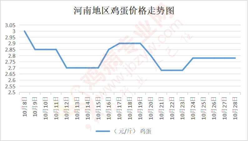 鸡病专业网消息:10月28日,河南郑州鸡蛋2.8元/斤,稳;新密鸡蛋2.8元/斤,稳;荥阳鸡蛋2.8元/斤,稳;中牟鸡蛋2.8元/斤,稳;周口鸡蛋2.75元/斤,稳;商丘鸡蛋84元/30斤,稳;鹤壁鸡蛋2.75元/斤,稳;汝州鸡蛋2.75元/斤,稳;开封鸡蛋83-84元/30斤,稳;漯河鸡蛋2.75元/斤,稳;漯河临颍鸡蛋2.75元/斤,稳;许昌鸡蛋2.8元/斤,稳;南阳鸡蛋2.75元/斤,稳;南阳邓州鸡蛋2.75元/斤,稳;新乡鸡蛋2.75元/斤,稳;安阳鸡蛋2.75元/斤,稳;新郑鸡蛋2.8元/斤,稳;登封鸡蛋2.8元/斤,稳;平顶山鸡蛋2.8元/斤,稳;驻马店鸡蛋2.8元/斤,稳;三门峡鸡蛋2.8元/斤,稳;焦作鸡蛋2.75元/斤,稳;信阳鸡蛋2.75元/斤,稳;濮阳鸡蛋2.75元/斤,稳。