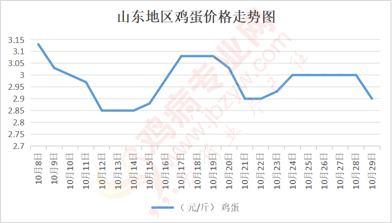 鸡病专业网消息:10月29日,山东地区莱阳鸡蛋2.95元/斤,落;青岛鸡蛋2.95元/斤,落;诸城鸡蛋2.9元/斤,落;安丘鸡蛋2.8元/斤,落;昌乐鸡蛋2.8元/斤,落;寿光鸡蛋2.8元/斤,落;昌邑鸡蛋2.8元/斤,落;高密鸡蛋2.9元/斤,落;青州鸡蛋2.8元/斤,落;临朐鸡蛋2.8元/斤,落;莱州鸡蛋2.95元/斤,落;威海鸡蛋2.95元/斤,落;临沭鸡蛋2.8元/斤,落;沂水鸡蛋2.8元/斤,落;沂南鸡蛋2.8元/斤,落;莒南鸡蛋2.8元/斤,落;兰陵县鸡蛋2.8元/斤,落;日照鸡蛋2.8元/斤,落;莒县鸡蛋2.8元/斤,落;日照辛萁商贸鸡蛋2.8元/斤,落;泗水鸡蛋价格81元/30斤,落;济宁、汶上鸡蛋价格81元/30斤,落;梁山、东平红蛋价格81元/30斤,落;枣庄滕州地区鸡蛋混码主流到户83元/30斤,落;泰安地区新泰鸡蛋价格81元/30斤,落;菏泽地区曹县主流到户81元/30斤,落;成武鸡蛋价格81元/30斤,落;单县到户81元/30斤,落;聊城莘县80元/30斤,落。