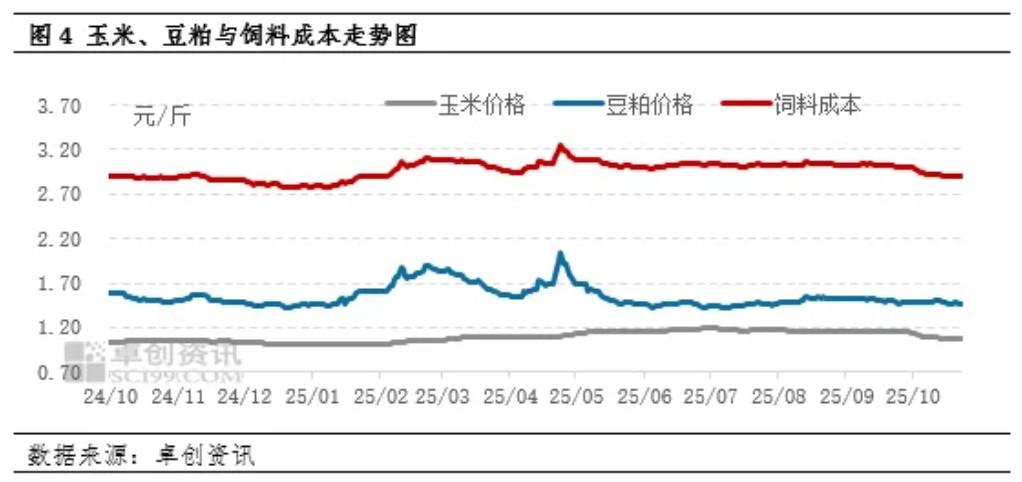 饲料原料价格均跌,降低饲料成本。玉米方面,10月份玉米市场供应量有增加趋势,需求量相对有限,因此价格小幅下跌,截至23日,全国玉米日均价2158.05元/吨,较月初跌幅5.26%。豆粕方面,工厂供应持续充裕,下游补库基本结束,需求端有走弱迹象,截至23日,全国豆粕日均价2933.33元/吨,较月初跌幅1.19%。综合计算目前全国单斤鸡蛋饲料成本2.90元,较月初减少3.33%,养殖支出减少。