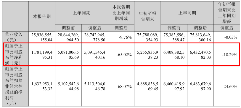 其中第三季度,公司营业收入259.37亿元,比上年同期减少9.76%;其中归属于上市公司股东的净利润17.81亿元,比上年同期减少65.02%;基本每股收益0.2678元/股,与上年同期减少65.11%。