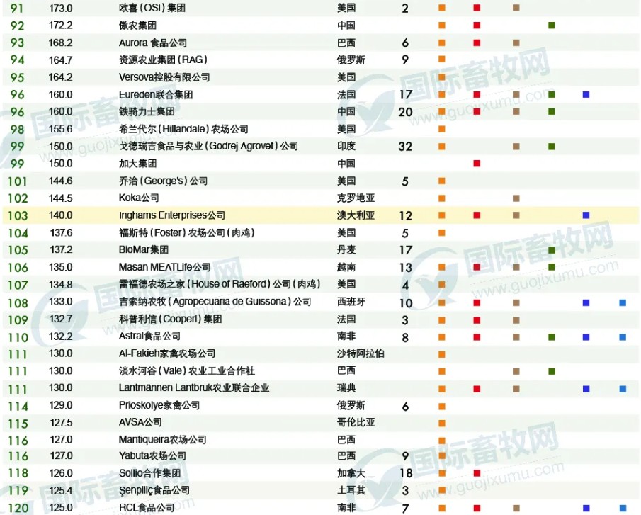 在中东地区,阿拉伯畜牧发展公司(ACOLID)排名从22位(718万吨)上升到第18位(756.8万吨),土耳其Matli公司排名从53位(288万吨)上升至第47位(300万吨)。